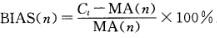 解析 乖离率指标(BIAS)的计算公式如下所示:。其中:Ct表示n日中第t日的收盘价;MA(n)表示n日的移动平均数;天数n表示BIAS的参数。