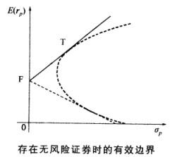解析 由无风险证券F出发并与原有风险证券组合可行域的上下边界相切的两条射线所夹角形成的无限区域便是市场组合的可行域(如图所示)。由无风险证券F出发并与原有风险证券组合可行域的有效边界相切的射线FT,便是在现有条件下所有证券组合形成的可行域的有效边界,即市场组合与无风险资产的组合构成资本市场线。