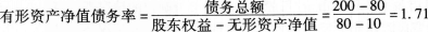 某公司某会计年度末的总资产为200万元,其中无形资产为10万元,长期负债为60万元,股东权益为80万元。根据上述数据,该公司的有形资产净值债务率为(  )...