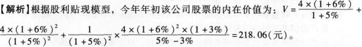 问题 今年年初,分析师预测某公司今后2年内(含今年)股利年增长率为6%,之后,股利年增长率将下降到3%,并将保持下去。已知该公司上一年末支付的股利为每股4元,市场上同等风险水平的股票的预期必要收益率为5%。如果股利免征所得税,那么今年年初该公司股票的内在价值最接近(  )元。