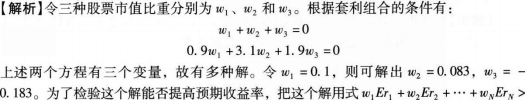 解析 0检验,可得0.1*0.16+0.083*0.2-0.183*0.13=0.881%,由于0.881%为正数,因此可以通过卖出第三种股票274.5万元(=-0.183*1500)同时买人第一种股票150万元(=0.1*1500)和第二种股票124.5万元(=0.083*1500)就能使投资组合的预期收益率提高0.881%。BCD三项均不满足套利组合的三个条件。