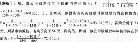 问题 假定某投资者在去年年初购买了某公司股票,该公司去年年末支付每股股利2元,预期今年支付每股股利3元,以后股利按每年10%的速度持续增长。假定同类股票的必要收益率是15%,那么正确的结论有(  )。 Ⅰ该公司股票今年年初的内在价值介于56元至57元之间 Ⅱ如果该投资者购买股票的价格低于53元,则该股票当时被市场低估价格 Ⅲ如果该投资者购买股票的价格高于54元,则该股票当时被市场高估价格 Ⅳ该公司股票后年年初的内在价值约等于48.92元