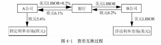 解析 双方进行货币互换的过程如图4-1所示。 货币互换前后A、B两家公司融资成本如表4-2所示。 表4-2货币互换前后A、B两家公司融资 公司 互换前成本 互换后成本 节约的融资成本 A公司 美元:LIBOR+0.2% 美元:LIBOR+0.2% 欧元:5.6%-6.1%=-0.5% 欧元:0.5% B公司 欧元:6.7% 美元:LIBOR-LIBOR=0 欧元:6.2% 欧元:0.5%
