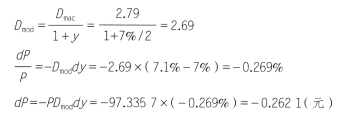 息票率6%的3年期债券,每半年付息一次。当前市场价格为97.3357元,到期收益率为7%,麦考利久期为2.79年。假设债券的到期收益率忽然增加至7.1%,...