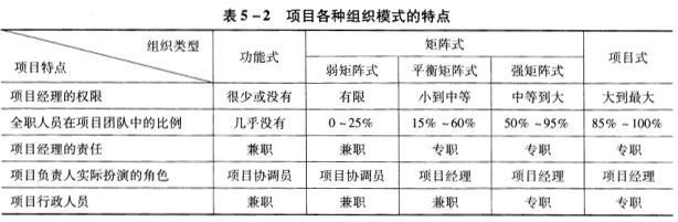 解析 项目组织结构形式与项目内各类人员的情况可以用表5-2来反映。由表可知,职能式和弱矩阵式组织模式中的项目经理是兼职的;而在项目式组织模式中,全职人员在项目团队中的比例为85%~100%。