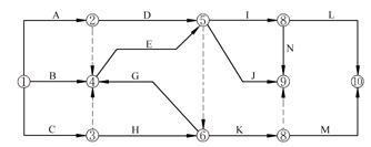 选项 A.有多个起点节点 B.有多个终点节点 C.存在循环回路 D.工作代号重复 E.节点编号有误