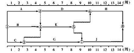 某工程双代号时标网络计划如下图所示,其中工作B的总时差和自由时差( )。 A.均为1周 B.分别为3周和1周 C.均为3...