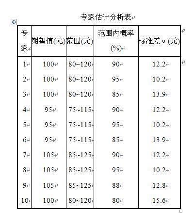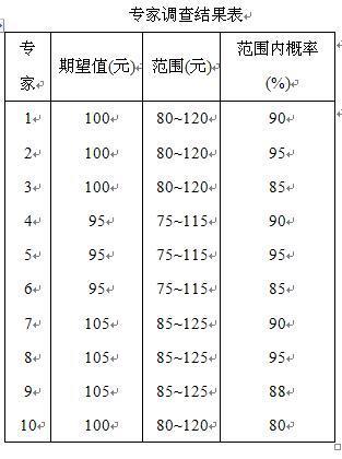 项目产品售价服从正态分布,请了10位专家对价格的范围及在该范围内的概率进行估计,调查结果见下表;请计算专家估计值的期望值和标准差。