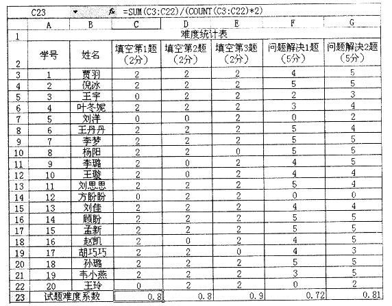 解析 数据处理前的准备:按如图所示的方式设置表头及输入数据。 第一步:单击C23单元格; 第二步:在C23中直接输入“ =SUM (C3 :C22) /(COUNT( C3 :C22) * 2) ”,回车,则在此单元格返回难度系数为0.8; 第三步:再单击C23,拖动右下角填充柄,往打拖动复制到填空结束,本例到E23,则其他难度系数也分别自动算出; 第四步:把E23的公式复制到F23,再把其中的“ * 2”改为“ * 5”(因为分值不同),即分值由2分改为5分; 第五步:单击F23,并拖动F23的填充柄往右复制。 依上操作方法,可以用计算机很快算出各题难度。 分析:从表中可以看出,各试题的难度系数都大于0. 5,所以此试卷的难度是合适的。