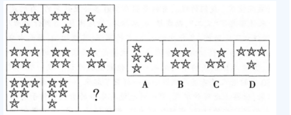 解析 【知识点】教师基本能力——逻辑思维能力 第一行三个图形的星星数量分别是4、3、2;第二行三个图形的星星数量分别是5、4、3;第三行三个图形的星星数量分别是6、5、(4)。并且每行每个图形最上层的星星数目依次减少,所以选择A。