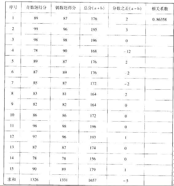 15名学生的语文测验成绩见下表,用分半法斯皮尔曼-布朗校正公式估计测验的信度。