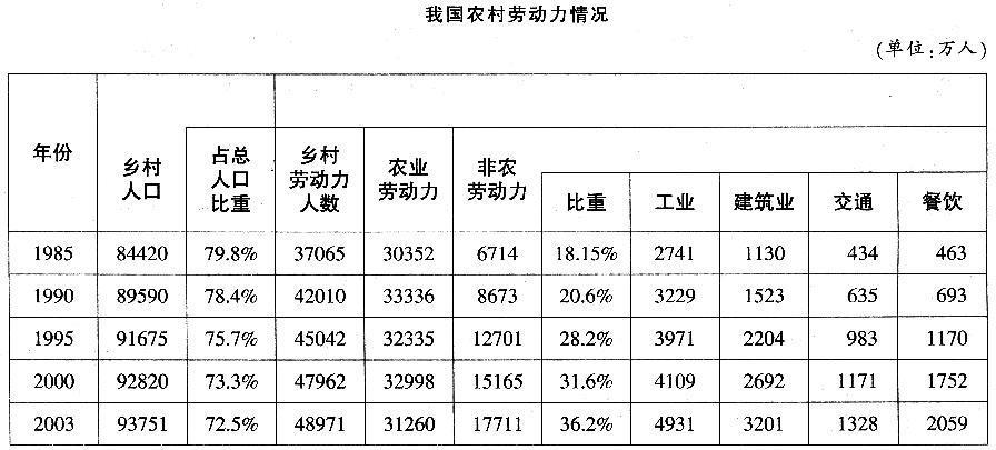 相关内容:材料,要点,本题,资料,目的,表格,1985年,1990年,1995年,2000年,2003年,我国,乡村,人口,劳动力,人数