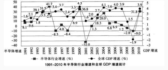 根据以下图表资料。回答56-60题。 以下图表数据来自世界银行和WSTS(世界半导体行业统计协会),反映了1991—2010年20年问全球GDP增长率和...