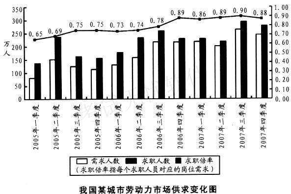 根据资料回答问题 2005~2007年,该市劳动力市场供需差最大的为(  )A.2005年第二季度 B.2006年第一季度 C.2007年第...