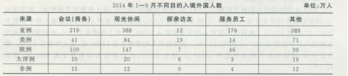 问题 2014年1~9月我国入境外国人共有1922万人,其中来自亚洲、美洲、欧洲、大洋洲、非洲的外国人分别为1184万人、229万人、408万人、58万人和43万人。分不同目的的入境外国人数见下表。 2014年1~9月以会议(商务)为目的的入境外国人数为( )