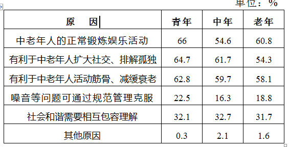 问题 某市统计局在针对噪音扰民的一次调查中,当问及受访市民对哪一类噪音反感时,选择社区广场舞活动噪音的占8.6%,比选择居民社区宠物狗叫声的低2.9个百分点。当被问及是否支持广场舞活动时,12.8%的受访市民表示无所谓或者不知道,12.0%的受访者表示反对,其他为支持者。在支持的市民中,当被问及支持的主要原因(多选)时,不同年龄段受访者的回答如下图所示。 支持广场舞等活动的受访市民选择各主要原因的比例 单位:% 在反对的市民中,被问及反对的主要原因(多选)时,不同区域受访者回答如下。 反对广场舞等活动的受访市民选择各主要原因的比例 此次调查中,在支持广场舞等活动的受访青年市民中,同时选择“中老年人的正常锻炼娱乐活动”和“有利于中老年人扩大社交、排解孤独”的至少有( )