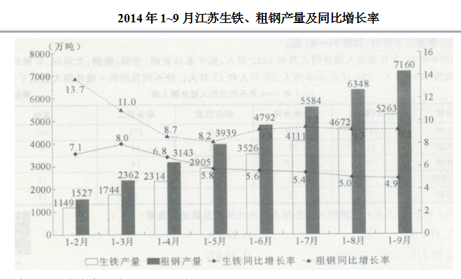 解析 D。A项,2014年第三季度的江苏的生铁产量为5263-3526=1737(万吨),该项正确。B项,由文字资料可得2014年1~9月江苏钢材产量同比增速呈下降趋势,该项正确。C项,由文字资料和图形资料可得,粗钢产量的年内累计同比增速一直高于钢材和生铁,该项正确。D项,由文字资料“1~2月产量为1932万吨”可得,1月和2月中至少有一个月的产量低于1000万吨,该项说法不正确,当选。