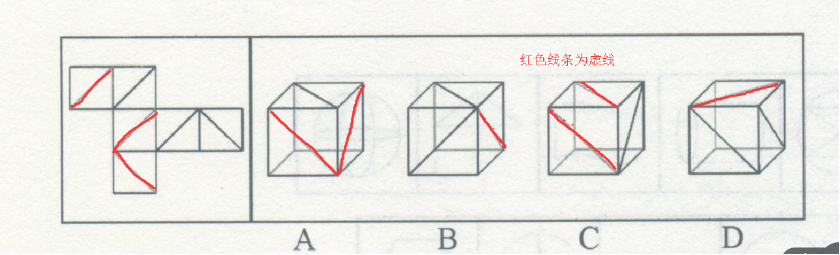 解析 A。根据展开图可知,正方形的三条实线相交于一点。B图中两条实线和一条虚线相交;C图右侧的实线两边端点都不可能有两条实线相连;D图中出现的两条实线并没有相交,排除。所以A项当选。