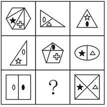 解析 遍历。每一行图形内部有6个小图形,分别是黑星星,白星星,黑圈,白圈,白三角,十字。因此,第三行问号处内部图形应该是白星星和十字,排除C,D。每一行封闭空间的数量分别是1,2,4.所以第三行问号处是一个封闭空间。因此本题选A。
