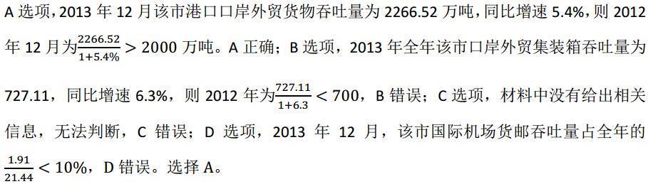 选项 A.2012年12月,该市港口口岸外贸货物吞吐量超过2000万吨 B.2012年全年,该市口岸外贸集装箱吞吐量超过700万标准箱 C.2013年该市国际机场货邮吞吐量一半以上是境内货邮 D.2013年12月,该市国际机场货邮吞吐量占全年的10%以上