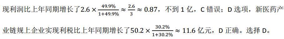 选项 A.主营业务收入占产值比重高于上年水平 B.规模以下企业当年实现利润额为负数 C.新光源产业链规上企业实现利润比上年同期增长了1亿多元 D.新医药产业链规上企业实现利税比上年同期增长了11亿多元