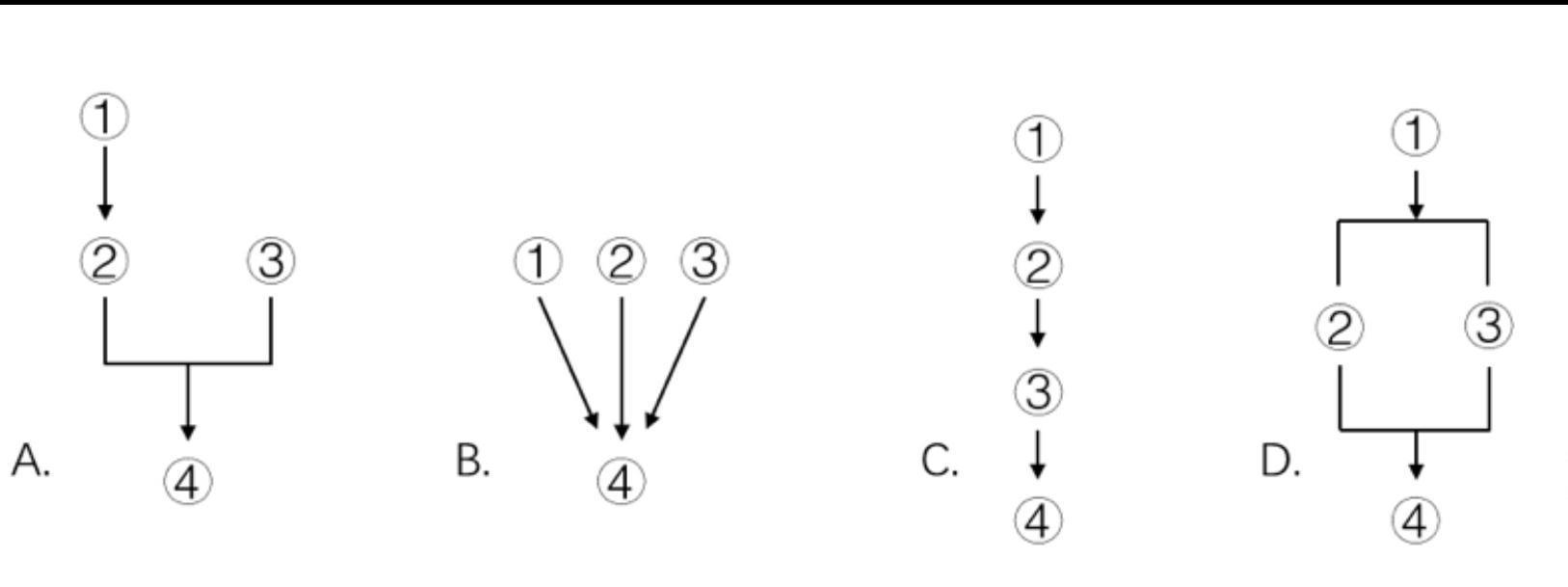 问题 (三) 人类对猫的态度经历过许多变化。埃及人首先发现了猫的价值,之后,包括印度在内的亚洲许多地区也纷纷开始驯养猫。这些地区的人们对猫的看法十分相似:他们重视猫,因为猫能消灭啮齿动物;他们崇拜猫,因为认为猫能带来好运,甚至直到现在,“招财猫”仍被当做幸运的标志;他们让猫居住在寺庙和宫殿里,有时会举行纪念仪式,祭奠逝去的猫的灵魂。 在整个中世纪,人们对猫的评价十分复杂。人们或是把猫当做捕鼠器,或是当做神顶礼膜拜,或是对其十分轻蔑,这都取决于猫栖息的地方和它们的主人。 信奉伊斯兰教的人们赞美猫,很有可能是因为先知穆罕默德十分喜爱猫。有一个流传很广的故事:一只猫在穆罕默德的衣袖上睡着了,穆罕默德想要起身离 开时,为了不吵醒它,就将那截衣袖割断了。有人据此认为,虎斑猫前额上的M标记代表的就是穆罕默德。但是在欧洲,黑猫却被与恶魔联系再一起。因为猫是夜行动物,人们认为它是女巫具有超自然能力的奴仆,甚至本身就是女巫。尽管这种看法最初只是针对黑猫,但是后来所有的猫都因此变得不受欢迎了。 对猫而言,中世纪的确是一段黑暗的历史。①猫被人们谴责、捕猎甚至杀掉,但对老鼠而言,这确实是一段最好的时光。②随着猫被大规模消灭,啮齿类动物失去天敌,数量大幅增长。自然界微妙的平衡被人类打破,自然不会有什么好结果。当时没有人意识到,数量极度膨胀的啮齿动物,③加上当时城镇里普遍较差的卫生条件,使人类经历了一个更加黑暗的时期,④他们遭遇了鼠疫,也就是黑死病。 当人们全神贯注地预防黑死病,照顾病人,埋葬死者,并为自己的损失哀痛之时,他们顾不上捕杀猫了。猫在数量上得到恢复后,便开始灭杀那些传播黑死病的鼠类。人们因此发现了老鼠、跳蚤与黑死病之间的联系,对猫有了新的认识。猫作为首要的鼠类控制器,重新获得人的认同。一个带走那么多人的生命的悲剧,却拯救了猫,而猫在某种程度上又拯救了人类,恢复了自身的形象,这是多么讽刺的事! 无论猫是起源于埃及还是中东,最终,他们通过帆船抵达了新大陆。在船上,他们是捕鼠者,在漫长的航程中,保护海员的食物。在完成航海任务后,人们让猫生活在田野牧场里,继续在新的定居点捕杀老鼠。许多年后,猫被当做家养动物,保护储存的食物免受老鼠和其他啮齿类动物的侵害。在美国的很多地方,人们仍会饲养看仓猫来控制啮齿类动物,允许猫自由繁殖。 18世纪中叶,越来越多的英格兰和西欧人把猫看作珍贵的宠物,养猫俱乐部应运而生。20世纪前半叶,虽然猫咪爱好者给自己的纯种猫喂食过多,但普通民众养的猫仍主要是户外动物,执行捕鼠任务。但是随着农场逐渐被城镇所取代,城市化规模逐渐扩大,越来越多的人们将看管仓库的猫带回家中,猫几乎完全变成人类的宠物。20世纪后半叶,猫咪爱好者甚至开始将猫当作家族中的一员。 下列哪一图示最恰当地呈现了文中画线句子之间的逻辑关系?