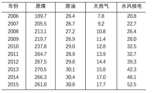问题 2005年我国GD.P为184937亿元人民币,主要能源生产总量为228.9百万吨标准煤,主要能源为原煤、原油、天然气和水风核电,分别生产177.2百万吨标准煤、25.9百万吨标准煤、6.6百万吨标准煤和19.2百万吨标准煤。“十一五”“十二五”时期我国主要能源生产情况见下表。 ?????????表2006—2015年我国主要能源生产情况?????????单位:百万吨标准煤 下列判断正确的是
