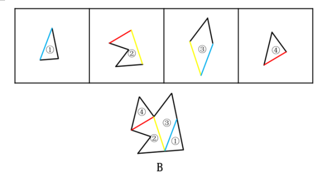 - 下边的四个图形中,只有一个是由上边的四个图形拼合(只能通过上、下、左、右平移)而成的,请把它找出来。