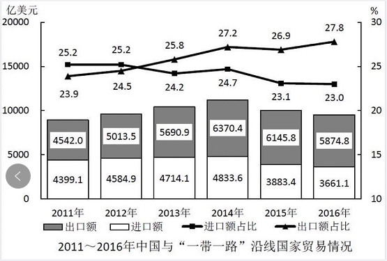 2015年,中国与“一带一路”沿线国家进出口贸易总额占当年中国进出口贸易总额的比重约为:A.24.7% B.22.8% C.27.2% D....