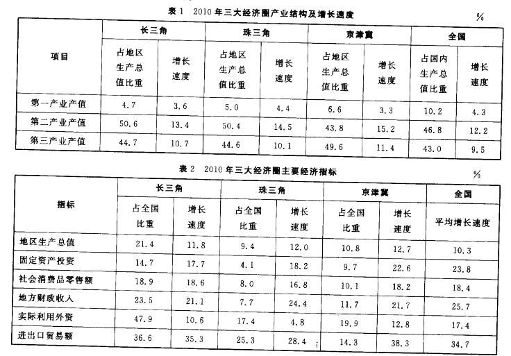 问题 三大经济圈中,2010年三产业增长速度均超过全国平均水平的有几个?( ) A. 0 B. 1 C. 2 D. 3