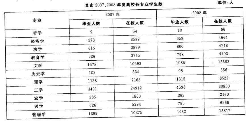 解析 本题计算量较大,宜用估算法解答。2007年在校人数的1.25倍若小于2008年在校人数即符合题意。估算后可知,经济学、教育学、文学和管理学在校生增长率超过25%,答案为B。