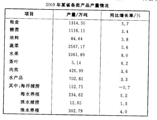 问题 2009年,某省全年粮食作物播种面积253. 85万公顷,比上年增长1. 5%;糖蔗种植面积13. 58万公顷,下降0. 2%;油料种植面积33.14万公顷,增长2. 3%;蔬菜种植面积113. 84万公顷,增长2. 3%。 能够从上述资料中推出的是( )。 A.与上年相比,2009年肉类的增产量高于水产品的增产量 B. 2008年,肉类和水产品总产量高于粮食产量 C. 2009年,茶叶种植面积比上年有所增长 D. 2009年,水产品捕捞业产量比上年有所下降