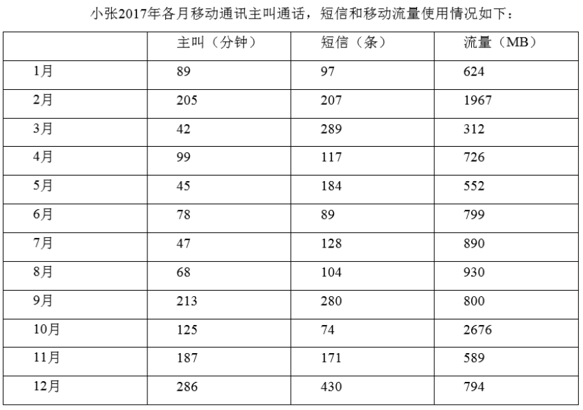 2017年,小张与电信运营商签订的移动通讯套餐合约如下 1、每月语音套餐费用48元,包含当月国内主叫通话200分钟,超出部分0.2元/分钟 2、每月短...