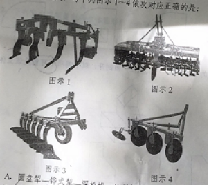 问题 旋耕机是以横轴式或立轴式旋转刀齿为工作部件的驱动型土壤耕作机械,有较强的碎土能力;铧式犁是一种全悬挂式耕地农具,由在一根横梁端部的厚重的刃构成,用来破碎土块并耕出槽沟从而为播种做好准备;深松机是一种用于改善行间深层土壤耕层结构的耕作机械;圆盘犁是利用凹面圆盘来耕翻土壤的耕作机械,可使土垡翻转和破碎。 根据上述定义,与下列图示1~4依次对应正确的是( )。