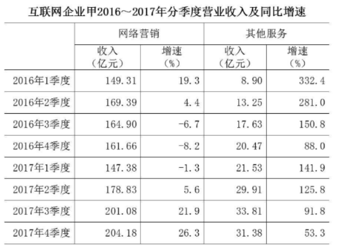 选项 A.2015年2季度甲企业流量获取成本高于20亿元 B.2016年1季度甲企业流量获取成本高于上季度水平 C.2017年上半年甲企业网络营销收入高于2016年下半年水平 D.2017年下半年甲企业其他服务收入同比增速高于上半年水平