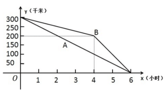 问题 A、B两辆车同时从甲地出发前往乙地。两车距离乙地的路程y(千米)与行车时间x(小时)的函数如图所示。求行车4小时时,两车相距多远?行车4小时之后到达终点之前,两车速度相差多少?