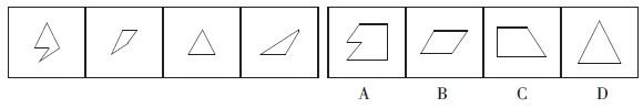 解析 题干要求只能通过上、下、左、右平移图形,A、C两项的直角不能通过平移得到,故排除;由第一个图形可排除B项,四个图形可拼合成图形如下。