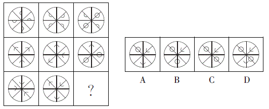 图形推理。请从所给的四个选项中,选择最合适的一个填在问号处,使之呈现一定的规律性。