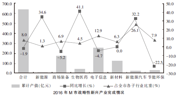 问题 2016 年 M 市战略性新兴产业完成情况 2016 年 M 市“四大产业集群”共完成行业产值 153.36 亿元,同比增长 4.8%,高于属地产值 增速 9.2 个百分点。 2016 年 M 市“四大产业集群”产值完成情况 战略性新兴产业一直是全区工业的重要增长点,全年共完成产值 643.7 亿元,占属地产值 的 21.2%,同比下降 1.9%,降幅慢于属地工业 1 个百分点。 2016 年,M 市属地产值的同比增速为:
