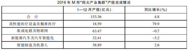2016 年 M 市战略性新兴产业完成情况 2016 年 M 市“四大产业集群”共完成行业产值 153.36 亿元,同比增长 4.8%,高于属地产值...