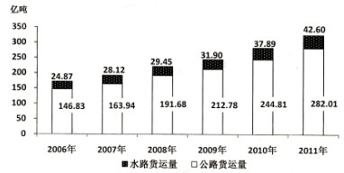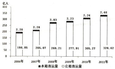 问题 2011年全国营业性客车完成公路客运量328.62亿人。旅客周转量16760.25亿人公里,比上年分别增长7.6%和11.6%。全国完成水路客运量2.46亿人。旅客周转量74.53亿人公里,比上年分别增长9.8%和3.1%。 图1 2006-2011年全国公路、水路客运量 2011年全国营业性货运车辆完成公路货运量282.01亿吨。货物周转量51374.74亿吨公里,比上年分别增长15.2%和18.4%。全国完成水路货运量42.60亿吨。货物周转量75423.84亿吨公里,比上年分别增长12.4%和10.2%。 图2 2006-2011年全国公路、水路货运量 注:旅客周转量=旅客人数×平均运送距离;货物周转量=运送货物的重量×平均运送距离。 2011年平均每人乘坐营业性客车所行进的距离约为: