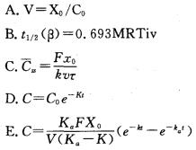 解析 本组题考查药动学基 本公式。表观分布容积V= X0/C0;单 室模型静脉注射给药血药浓度一时 间公式为C=C0e-kt;单室模型血管 外给药血药浓度一时间公式为C=Ka为吸收速度常数,只有血管外给药有吸收过程。