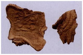 解析 图片中药材是狗脊,其来源为蚌壳蕨科金毛狗脊的干燥根茎,主产于福建、四川等省。其药材,生狗脊片呈不规则长条形或圆形,切面浅棕色,较平滑,近边缘1~4mm处有1条棕黄色隆起的木质部环纹或条纹,边缘不整齐,偶有金黄色绒毛残留,质脆,易折断,有粉性。熟狗脊片呈黑棕色,质坚硬,木质部环纹明显。