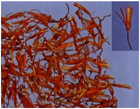 解析 第二图药材是红花。药材:为不带子房的管状花,长约1~50px。表面黄色或红色。花冠筒细长,先端5裂,裂片呈狭条形,长0.5~20px;雄蕊5,花药聚合呈筒状,黄白色;柱头长圆柱形,顶端微分叉。质柔软。气微香,味微苦。