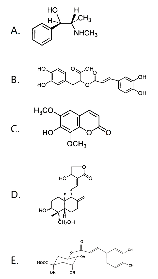 解析 A是麻黄碱,具有手性立体异构,有收缩血管升高血压,兴奋中枢神经的作用。B是迷迭香酸,具有扩张冠状动脉的作用。C是异嗪皮啶,具有一定的抗菌、消炎、止痛、抗肿瘤的活性。D是穿心莲内酯,属于二萜内酯,具有抗炎作用。E是绿原酸,为一分子咖啡酸与一分子奎宁酸结合而成的酯。