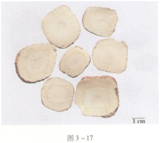解析 图3-17所示的药材是白芷,表面灰黄色至黄棕色,有多数纵皱纹、支根痕及皮孔样横向突起,习称“疙瘩丁”。故此题选C。