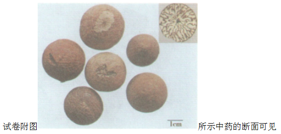 解析 本组题考查中药材经验鉴别术语及识图。图21为槟榔,图22为大黄,图23为何首乌。药材断面的特征往往与组织结构、细胞内含物有密切的关系,槟榔断面具“大理石样花纹”,“朱砂点”是指药材断面散在的红棕色油点,如茅苍术。断面还可以反映异常构造的特征,如何首乌的“云锦状花纹”(皮部异型维管束);商陆的“罗盘纹”(同心环形异型维管束)等。