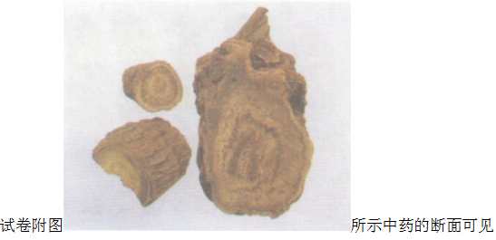 解析 本组题考查中药材经验鉴别术语及识图。图21为槟榔,图22为大黄,图23为何首乌。药材断面的特征往往与组织结构、细胞内含物有密切的关系,槟榔断面具“大理石样花纹”,“朱砂点”是指药材断面散在的红棕色油点,如茅苍术。断面还可以反映异常构造的特征,如何首乌的“云锦状花纹”(皮部异型维管束);商陆的“罗盘纹”(同心环形异型维管束)等。