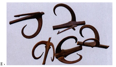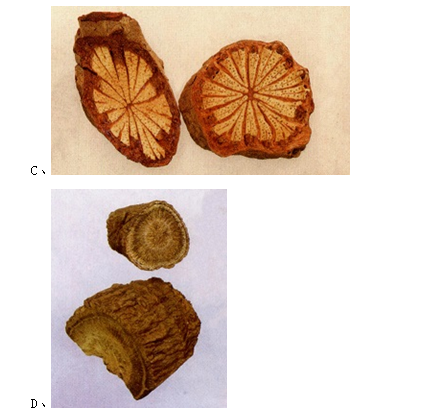 解析 A为狗脊,B为鸡血藤,C为大血藤,D为大黄,E为钩藤。